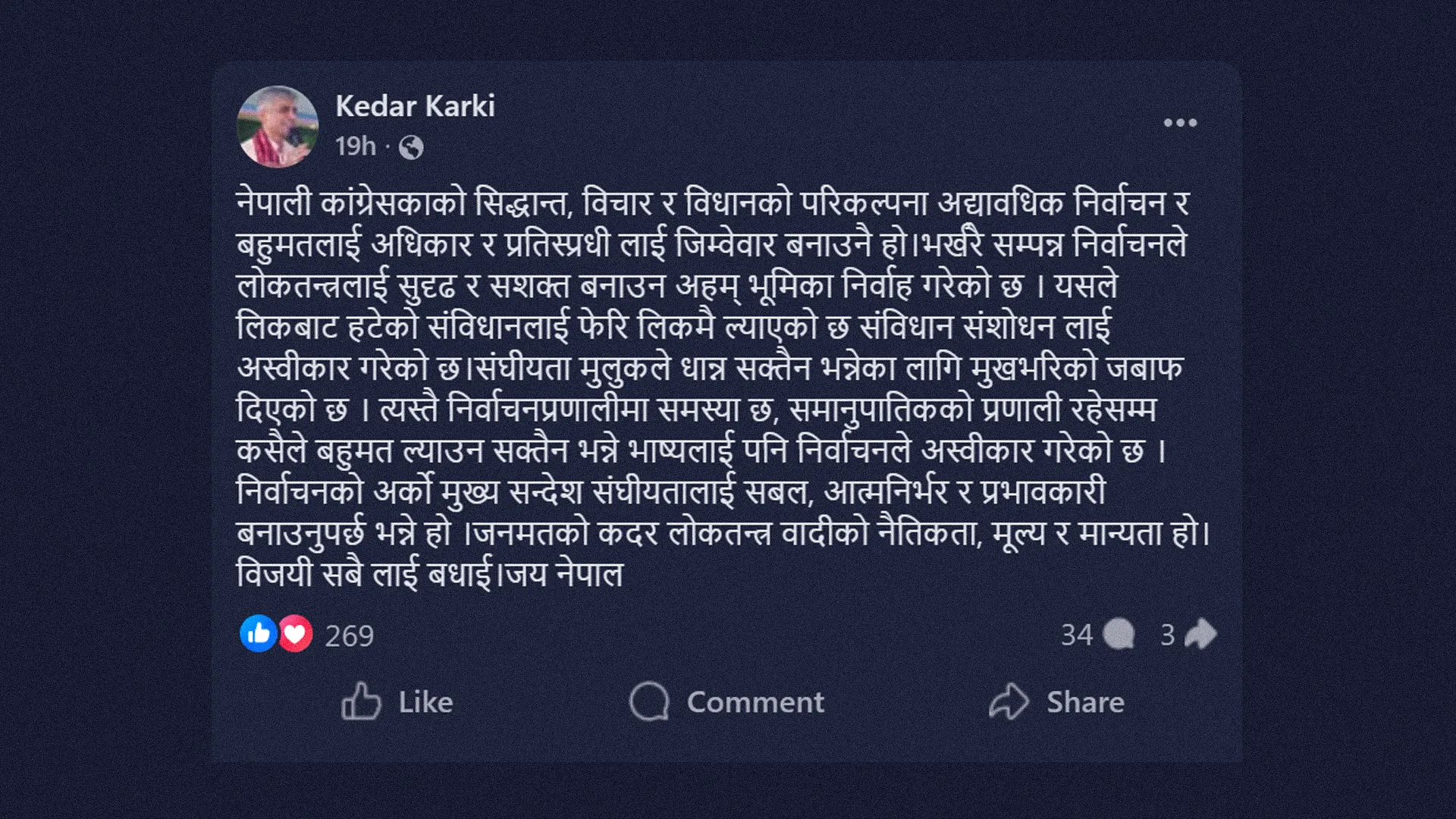 He wrote, "The vision of the Nepali Congress's principles, ideology, and statute is to empower the majority through periodic elections and hold competitors accountable. The recently concluded election has played a crucial role in strengthening and empowering democracy. It has brought the derailed constitution back on track and has rejected constitutional amendment."