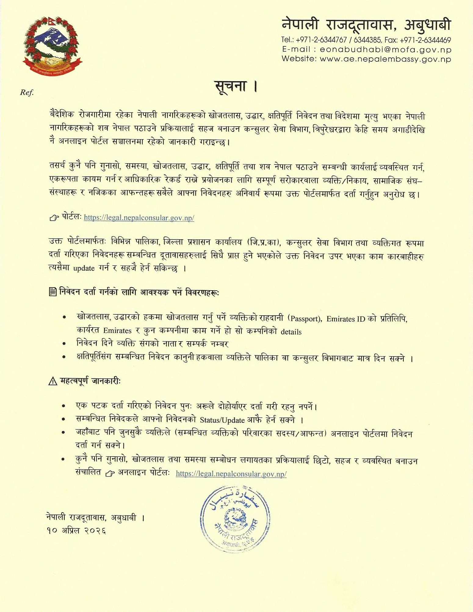 Abu Dhabi, April 11. To make the process of search, rescue, compensation, and repatriating the bodies of deceased Nepali citizens in foreign employment more convenient and systematic, the Embassy of Nepal in Abu Dhabi has requested that all applications be mandatorily registered through the online portal.