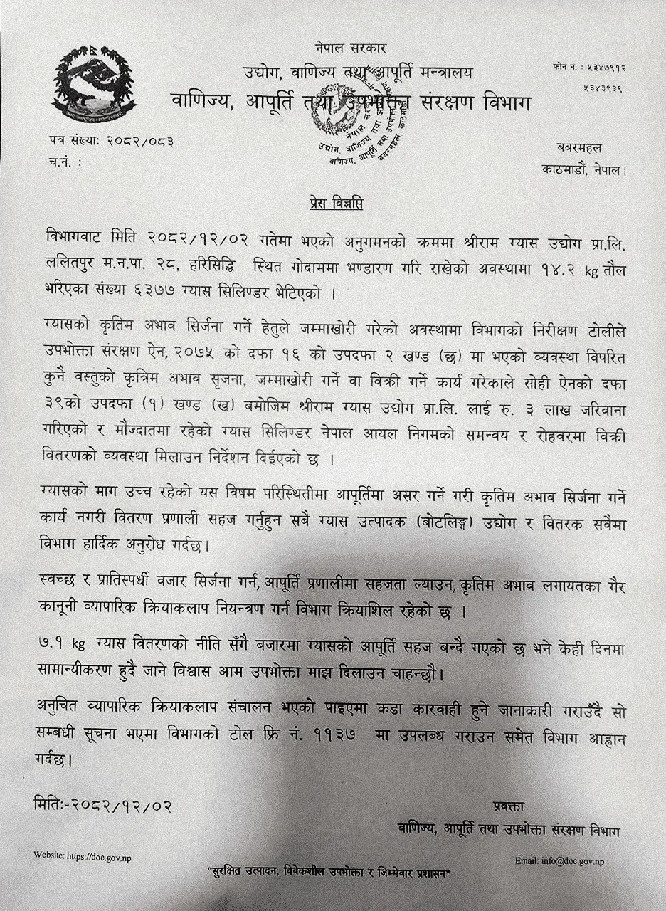As a result, Shriram Gas Industry was fined Rs 300,000. The inspection also led to penalties against other businesses, including Badimalika Food Store, which was fined Rs 15,000, and Duwadi Store and Multi Trade, which was fined Rs 5,000.