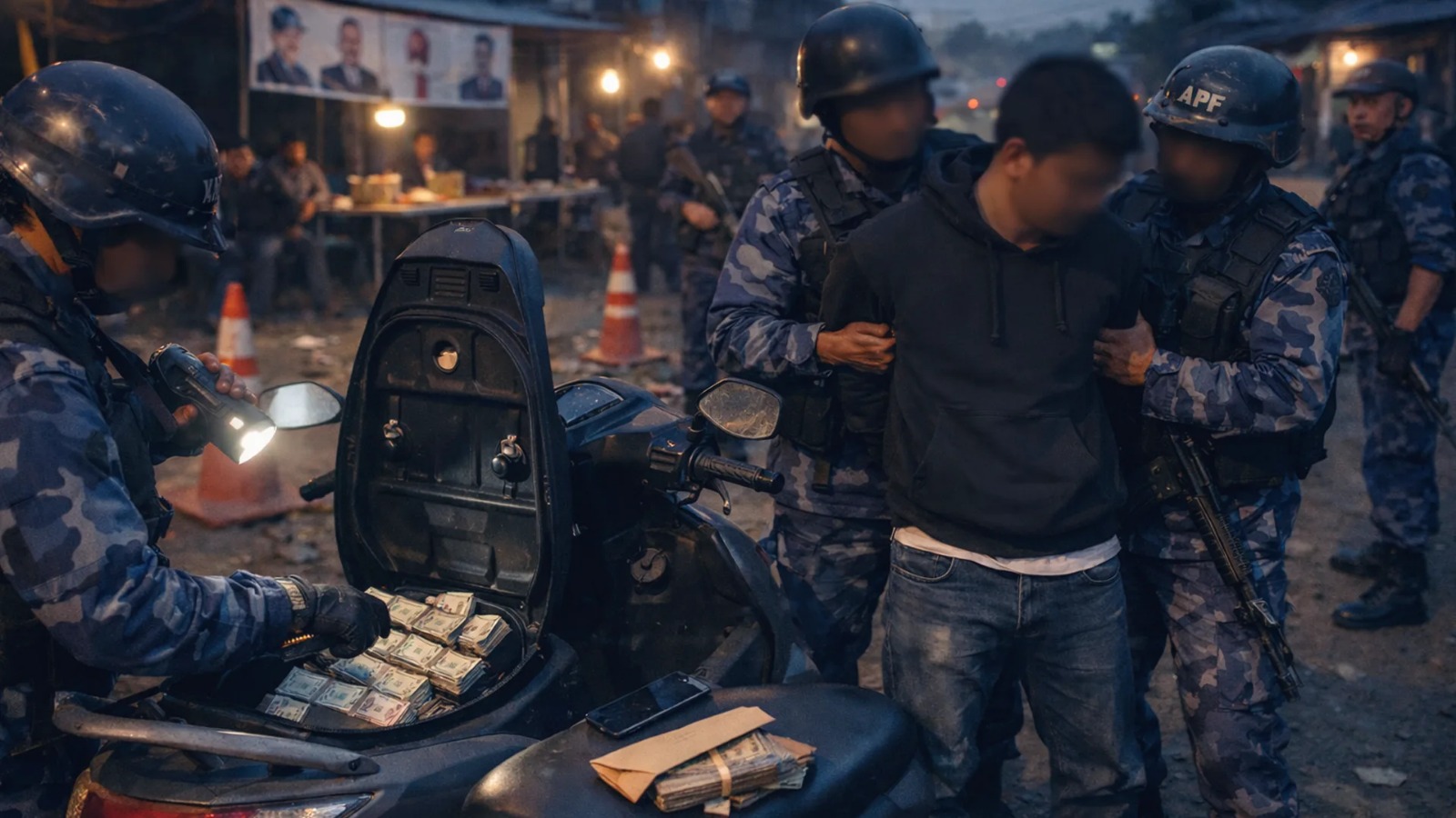 Armed Police Force personnel arrested a young man in Damak, Jhapa, on Wednesday evening for allegedly transporting cash to influence voters during the election's silent period. The team detained the suspect at Shripali Chowk in Damak-7, a location situated within the constituency of K.P. Sharma Oli.