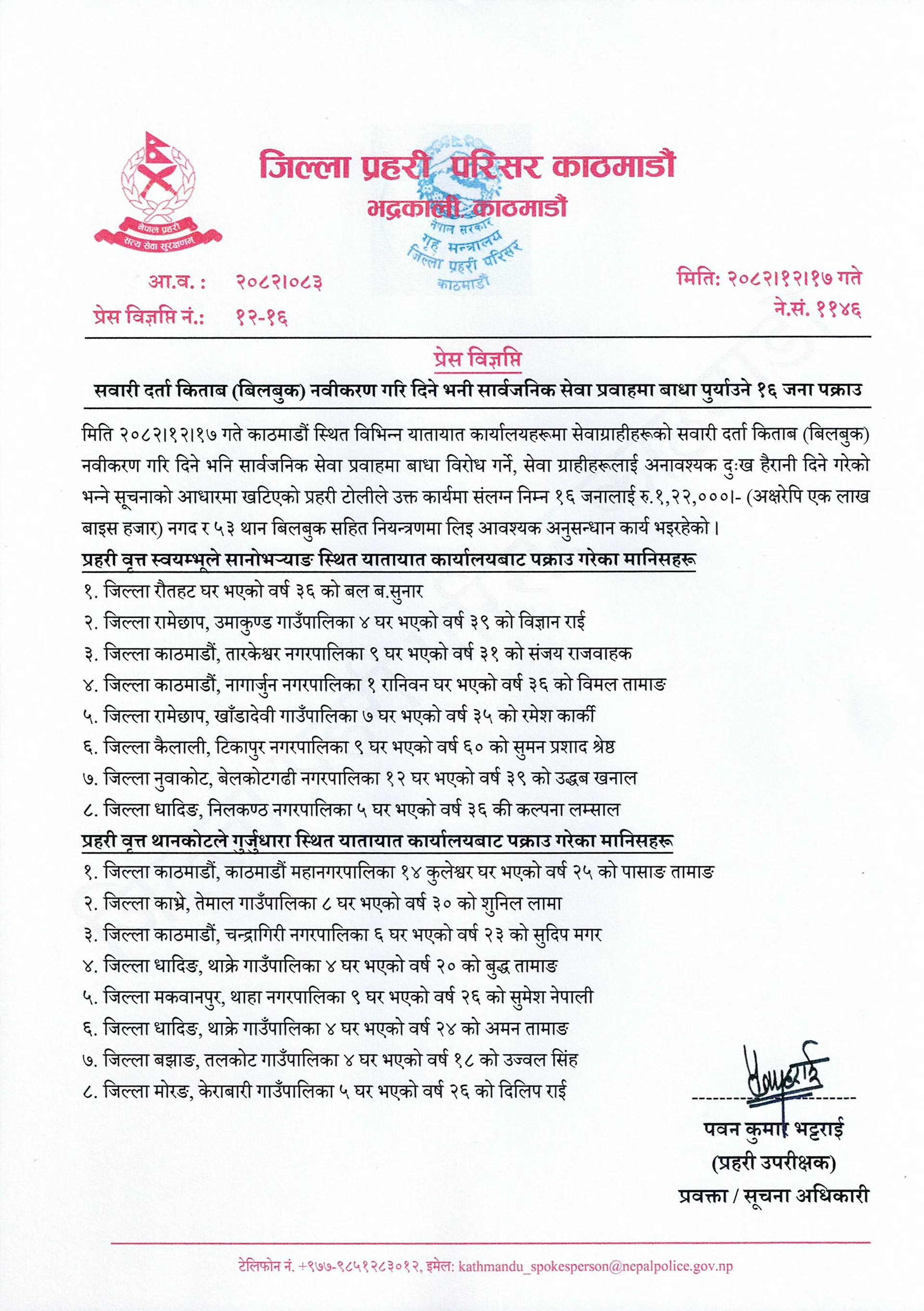 Law enforcement authorities in Kathmandu have taken 16 individuals into custody for allegedly interfering with public service delivery at various transport management offices. The arrests were made following reports that middlemen were causing unnecessary distress to citizens by claiming they would facilitate the renewal of vehicle registration certificates, commonly known as "bluebooks."