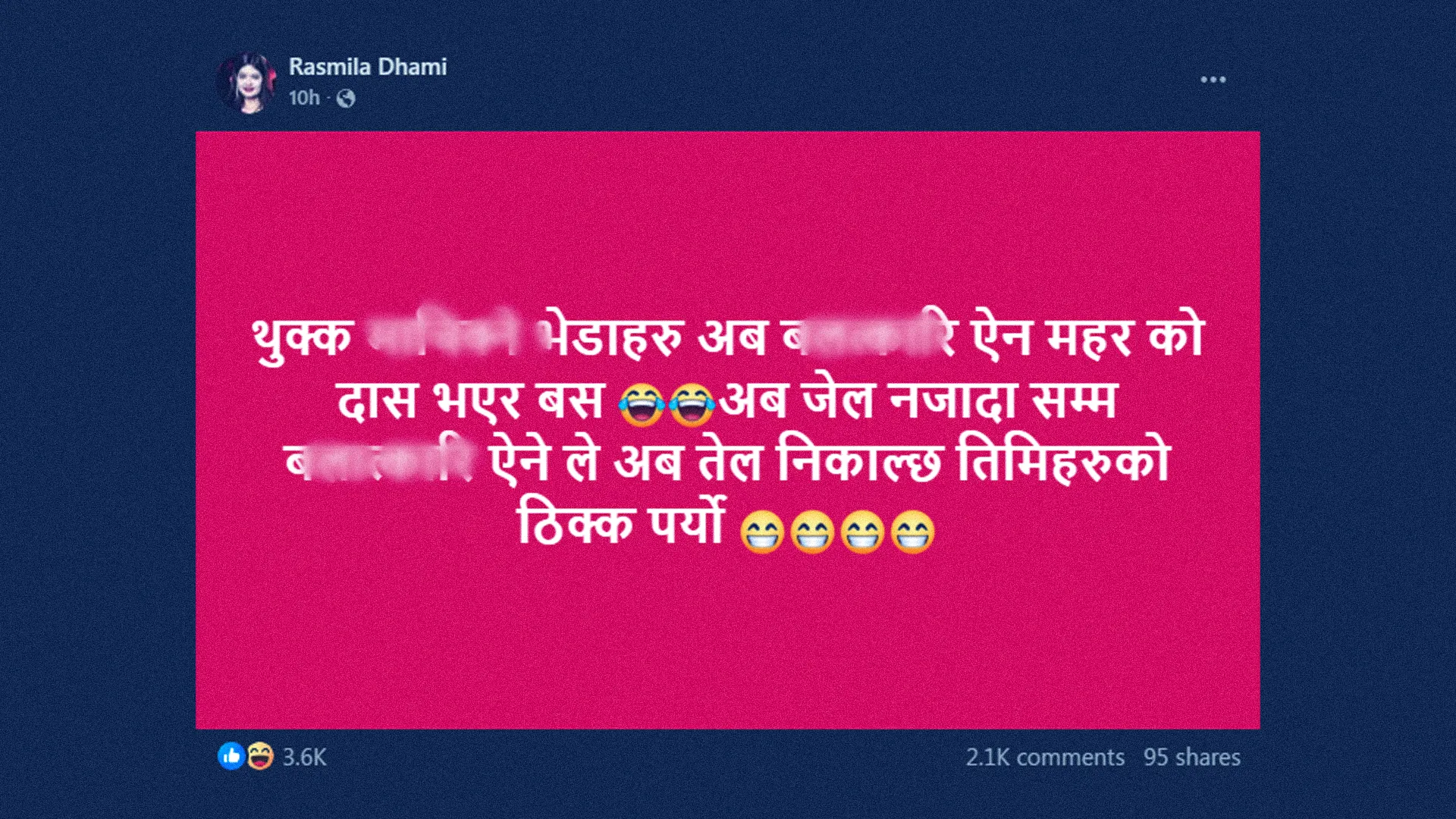 Kathmandu: A status containing serious allegations has been posted on social media targeting Ain Mahar, the newly elected Member of the House of Representatives from the Communist Party of Nepal (Unified Marxist-Leninist). A young woman named Rasmila Dhami, who has been fighting a legal battle against Mahar for a long time, has defamed him on Facebook by calling him a 'rapist'.