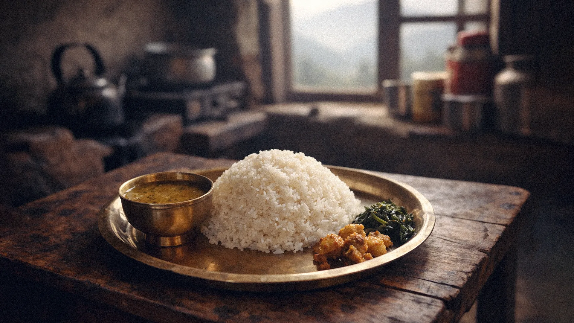 The Inciting Incident: A young farmer or porter eats a massive meal of Dal Bhat. It is cheap, filling, and provides the "complete protein" needed for 12 hours of labor in terraced fields.